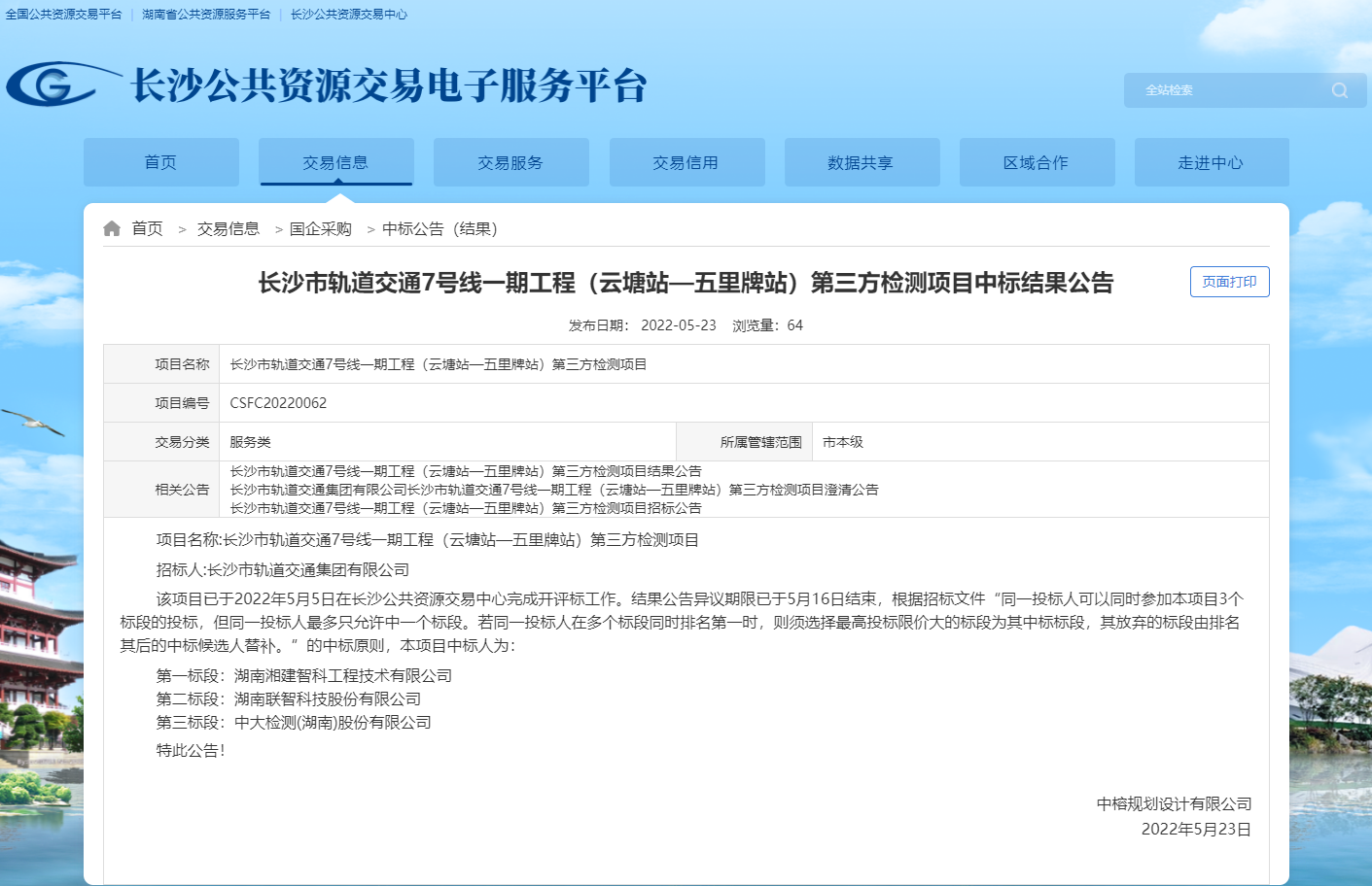 恭喜中标|湘建智科中标長沙市(shì)軌道交通師朋7号線一(yī)期工程第三方檢測項目