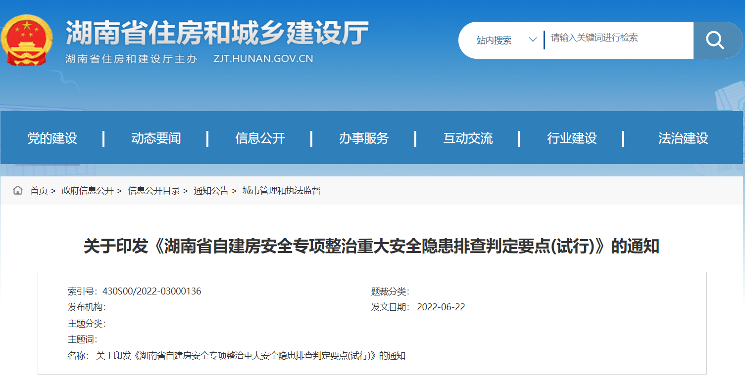 湖南(nán)省住建廳發布《湖南(nán)省自建房(fán很劇g)安全專項整治重大安全隐患排查判定要點(試行道物)》