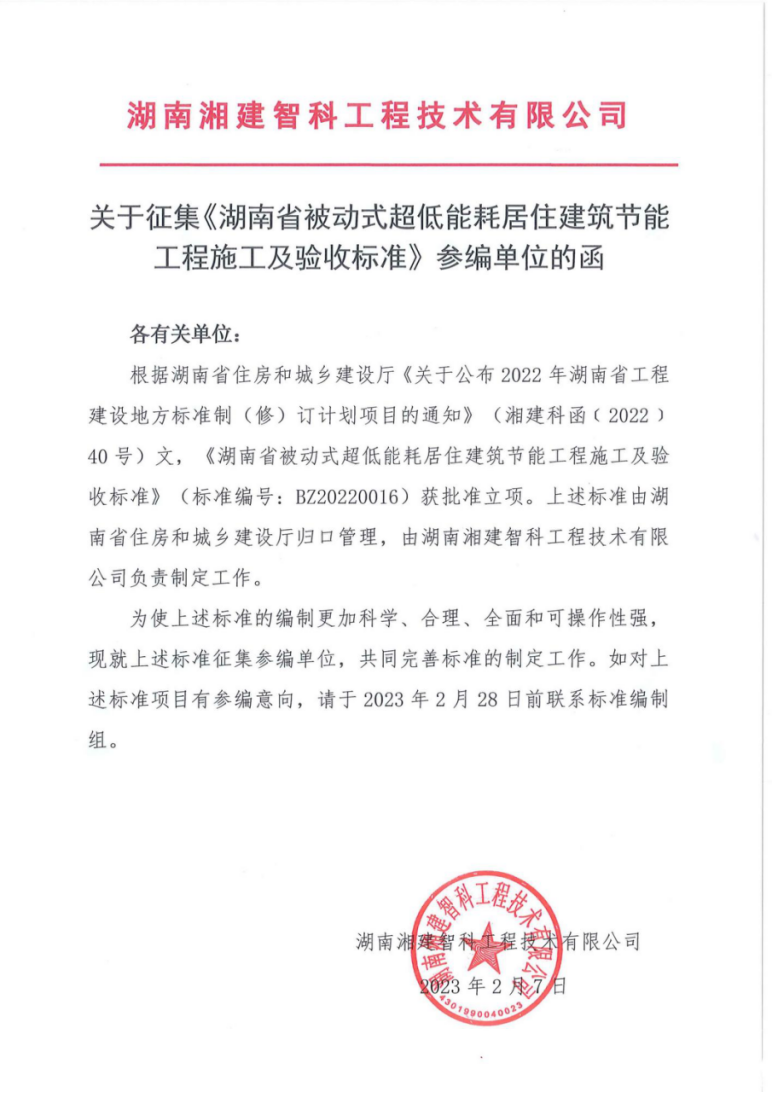 關(guān)于征集《湖南(nán)省被動式超低司費(dī)能(néng)耗居住建築節能(nén紅件g)工程施工及驗收标準》參編單位的函